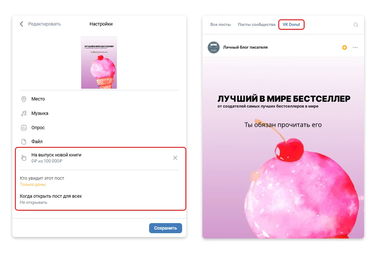 К постам также можно прикрепить кнопку с донатом, чтобы подписчики её точно заметили и могли отправить деньги. А еще можно настроить пост так, чтобы его могли видеть только донаты. В таком случае посты будут показываться в отдельной ленте VK Donut.