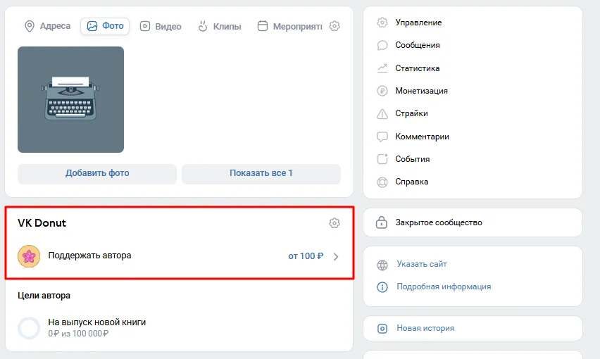 Подключить VK Donut можно в разделе «Управление» на странице сообщества.