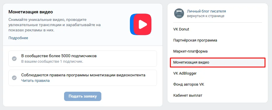 ВКонтакте. Монетизация видео и клипов во ВКонтакте начинается с 5000 подписчиков в сообществе и с заявки на участие в программе. Требований к контенту очень много. К примеру, если вы что-то продаете или рекламируете услуги, монетизацию не подключат. Поэтому не факт, что после подачи заявки даже с необходимым числом подписчиков и суточным охватом не менее 10 000 пользователей вам позволят зарабатывать. Отказ может быть без объяснений, а повторную заявку можно отправить только через два месяца.