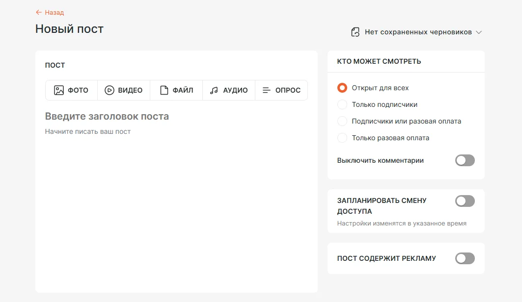 Обратите внимание, что также есть функция показа поста за разовую оплату. Так, к примеру, можно продавать товары без подписки.