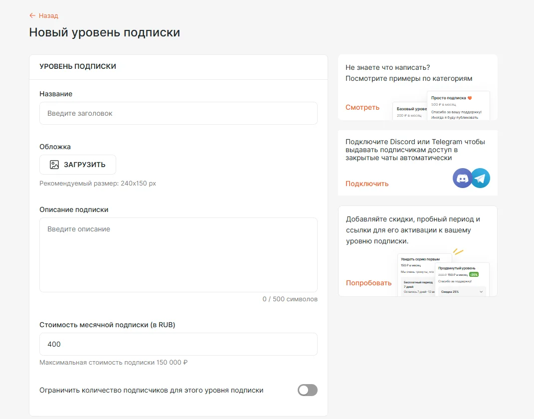 После регистрации нужно написать текст о себе, загрузить лого и обложку, настроить уровни подписки.