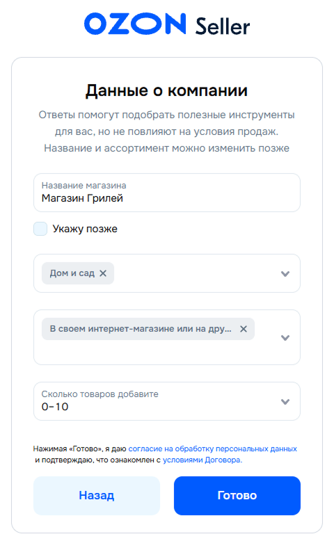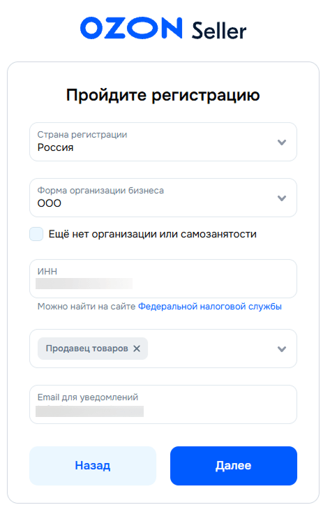 1. Переходим на сайт Ozon для продавцов и регистрируемся. Всплывёт вот такое окно: