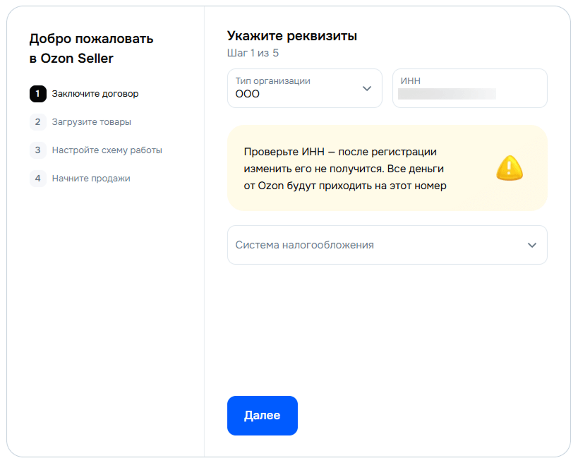 4. Затем вы попадёте в личный кабинет продавца. Там нужно указать реквизиты, дождать проверки от Ozon, заключить договор с маркетплейсом. Вам останется загрузить товары, выбрать схему работы и можно торговать.