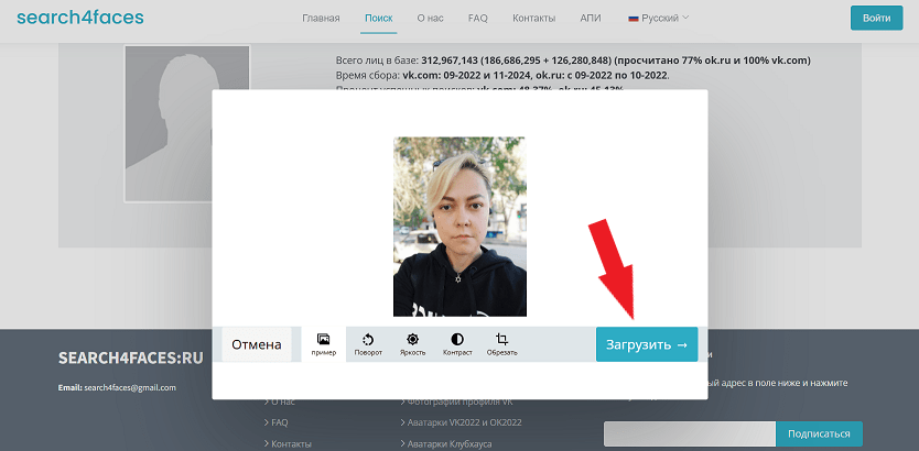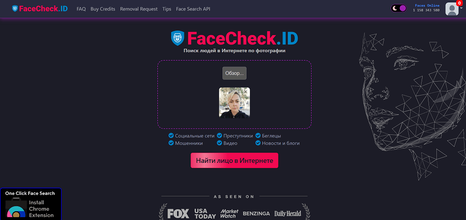 FaceCheck.ID. Еще один сервис распознавания лиц, который поможет найти человека по фото. Не требует регистрации, базовым поиском можно пользоваться бесплатно, а расширенные данные открываются за кредиты (внутренняя валюта). Стоимость одного полноценного поиска — 3 кредита. Минимальный тариф стоит $6. Этой суммы хватит на 12 полноценных проверок.