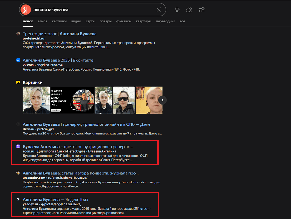В выдаче по имени и фамилии есть ссылка на мой профиль в Zoon, который я заводила только для увеличения количества упоминаний в сети.