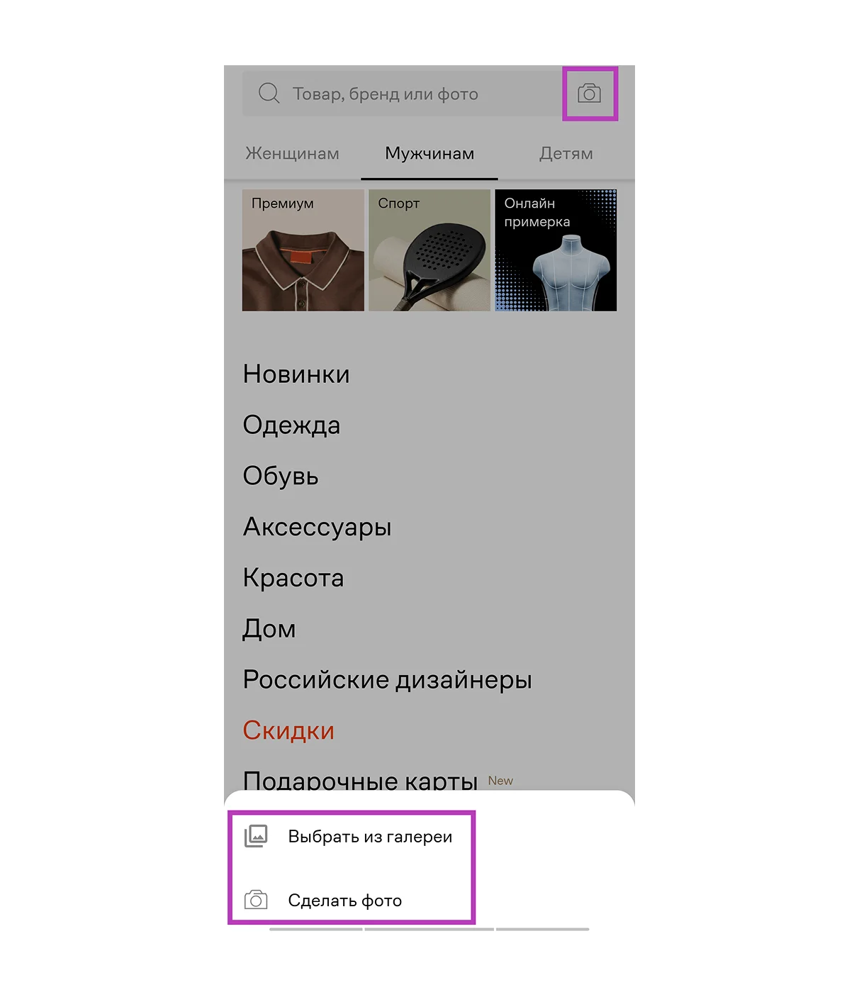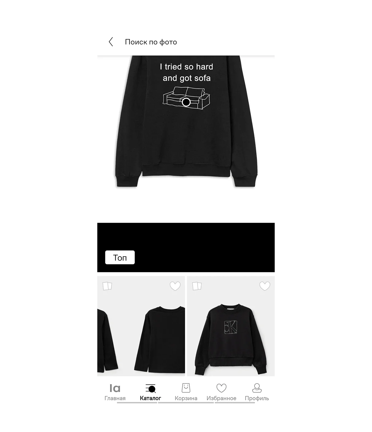 Lamoda работает сервис так же, как и предыдущие: загружаете фото в сервис, кликаете по кнопке «Искать» — и система начинает работу. Но эта функция работает только в мобильном приложении, в веб-версии — нет.