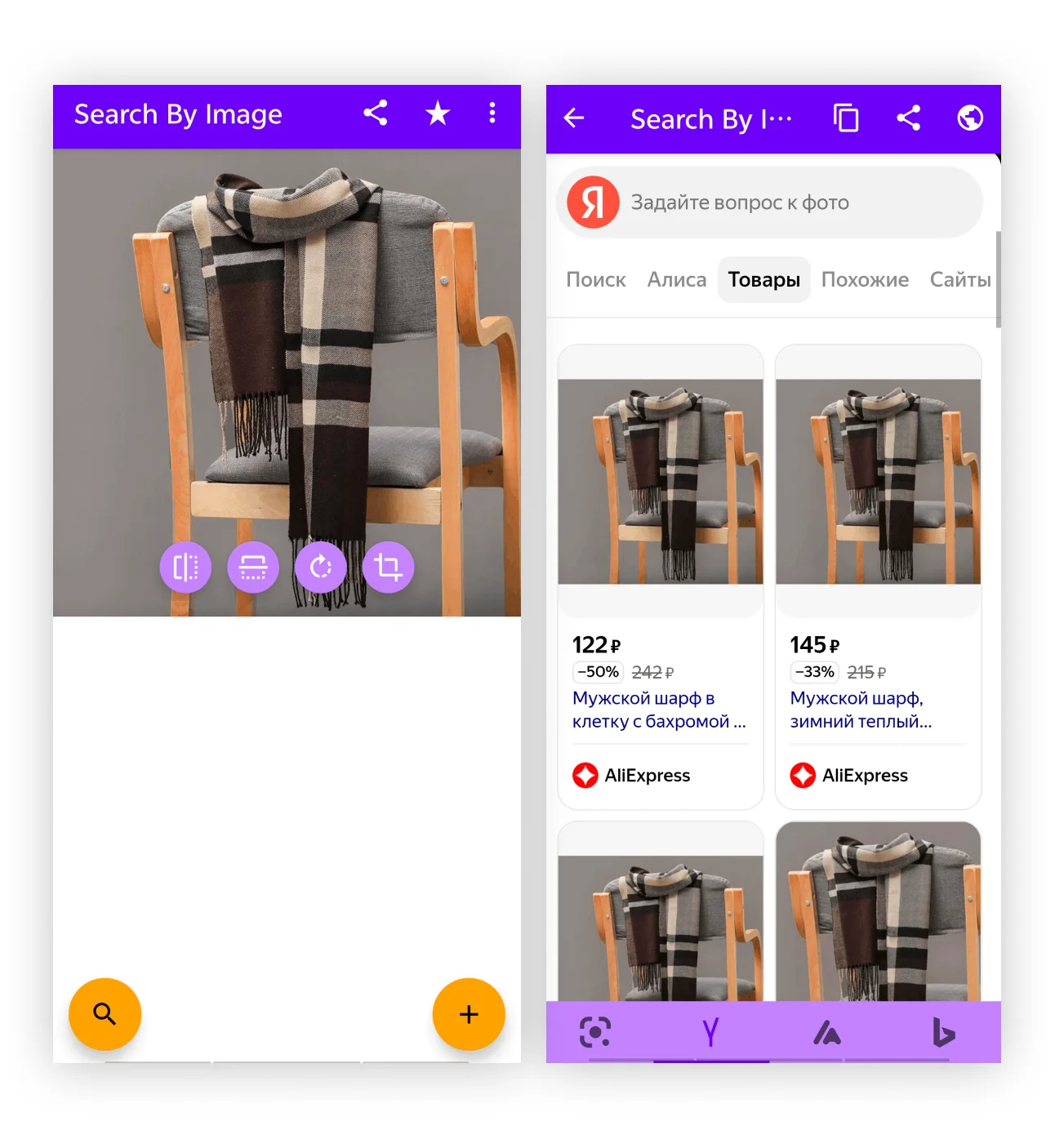 После загрузки фото можно вырезать фрагмент, повернуть или отразить изображение. Когда все готово, нажмите на значок лупы, чтобы начать поиск по картинке.