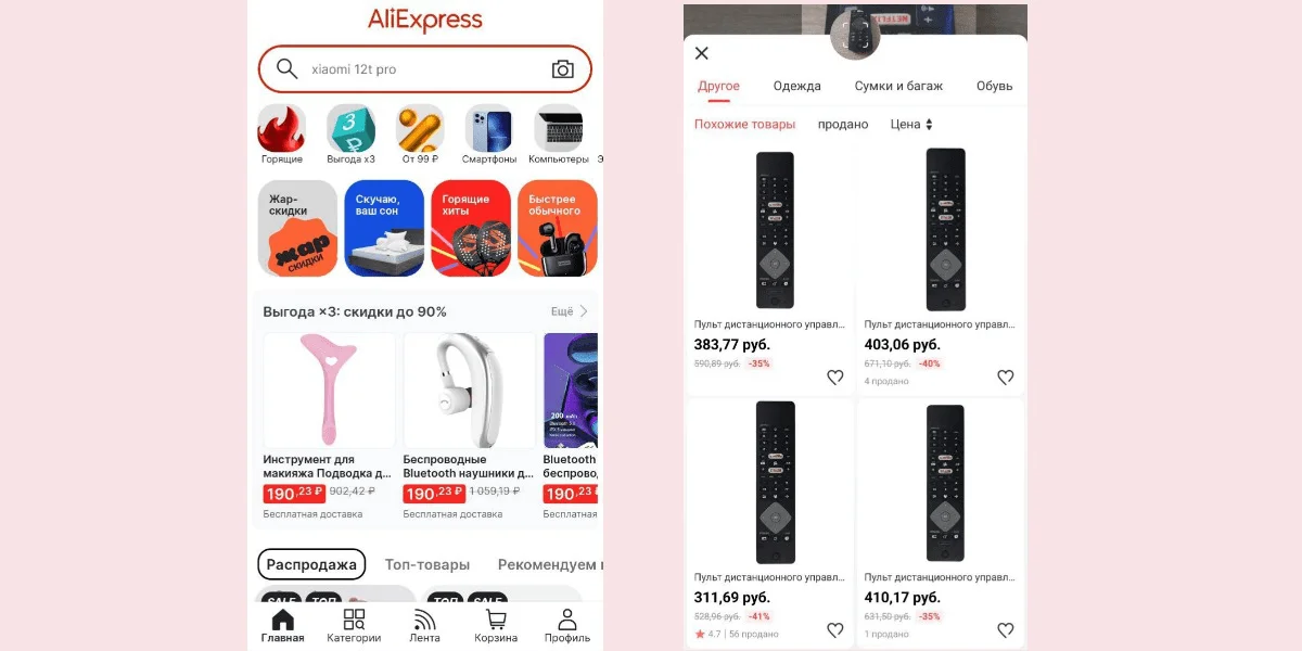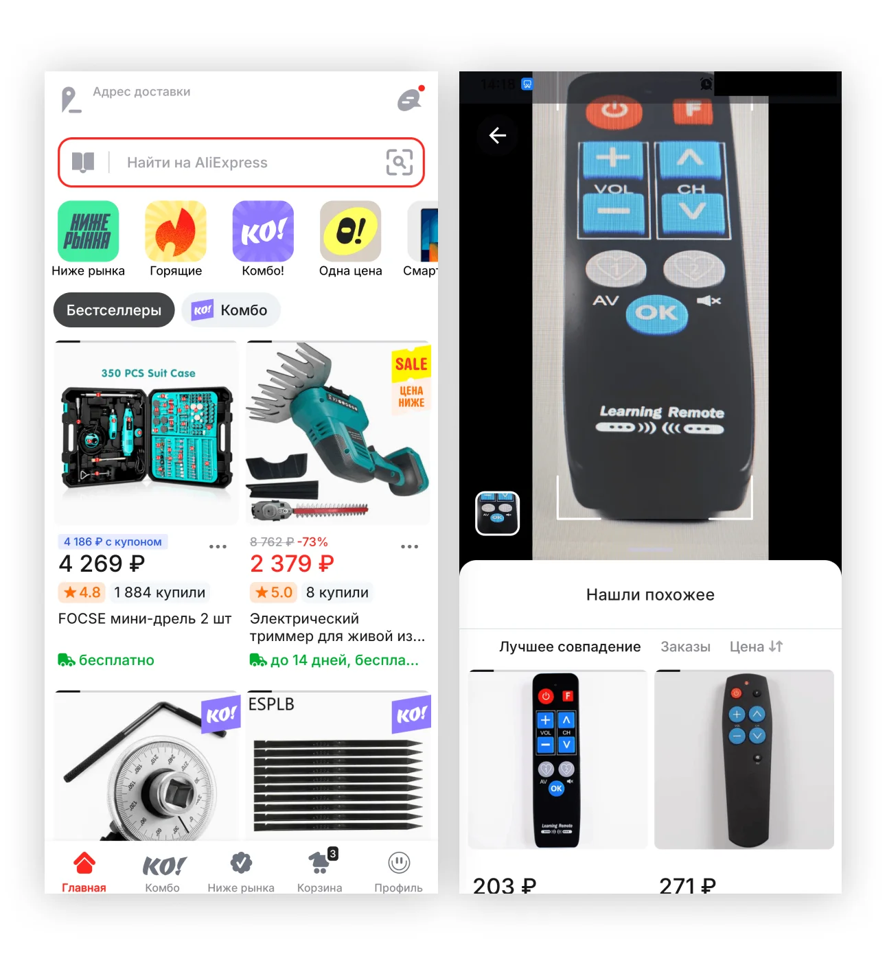 Всемирно известная торговая площадка с огромным количеством предложений. Внутри есть поиск как по тексту, так и по фото. Поиск по фотографии работает только с мобильной версии. Чтобы найти нужный продукт, просто сфотографируйте его или загрузите фото товара из галереи. После этого сервис покажет все объекты, которые подходят по картинке.
