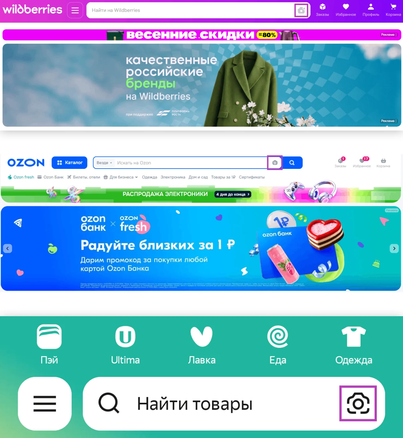 Wildberries, Ozon и Яндекс Маркет — три крупнейших российских маркетплейса, которые тоже внедрили в свою работу поиск по фото (у Яндекс Маркета функция доступна только в приложении). Можно загрузить картинку с товаром, который хочется приобрести, и запустить поиск. Сервисы найдут подходящие товары и покажут их карточки. Для перехода к покупке достаточно кликнуть на нужный товар.