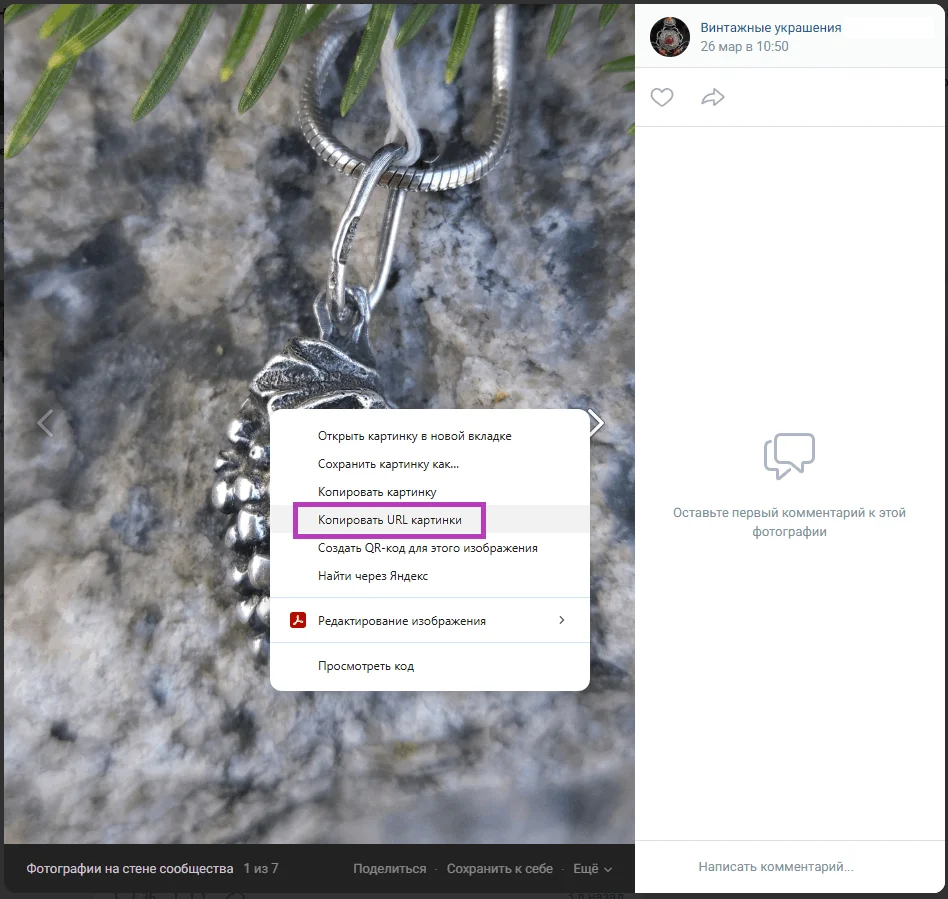 Кликните правой кнопкой мыши по картинке и выберите «Копировать адрес изображения»/«Копировать URL картинки» (в разных браузерах пункт может называться по-разному).