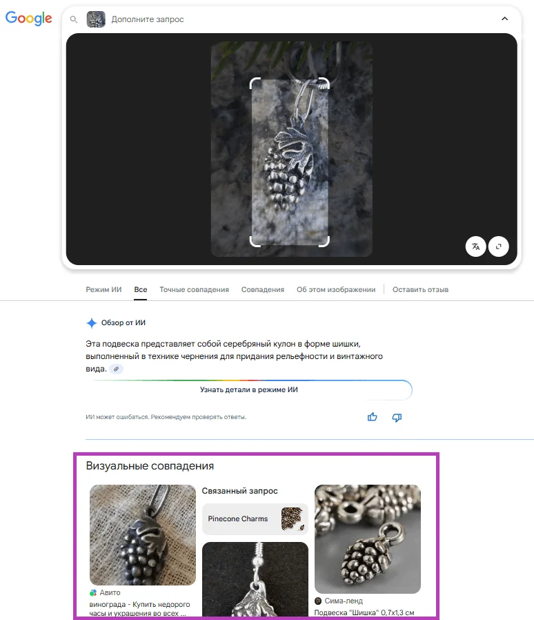 Если приложение выдает неподходящие результаты, попробуйте заново отсканировать объект и запустить поиск снова.