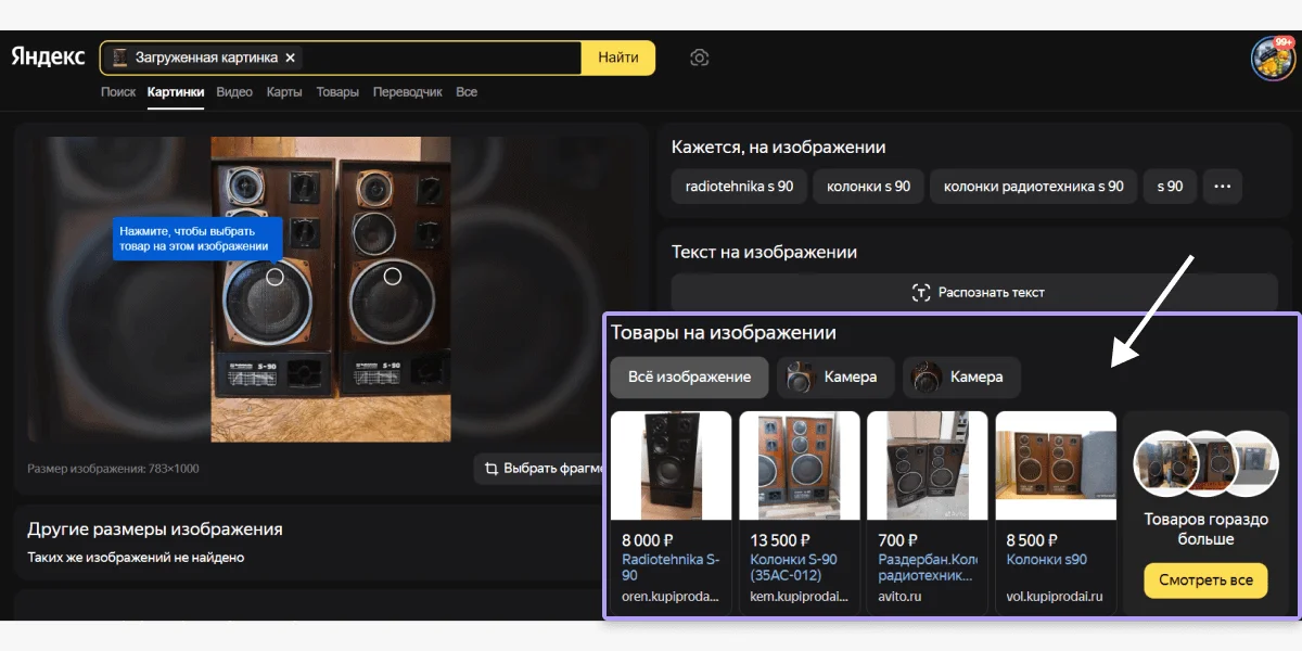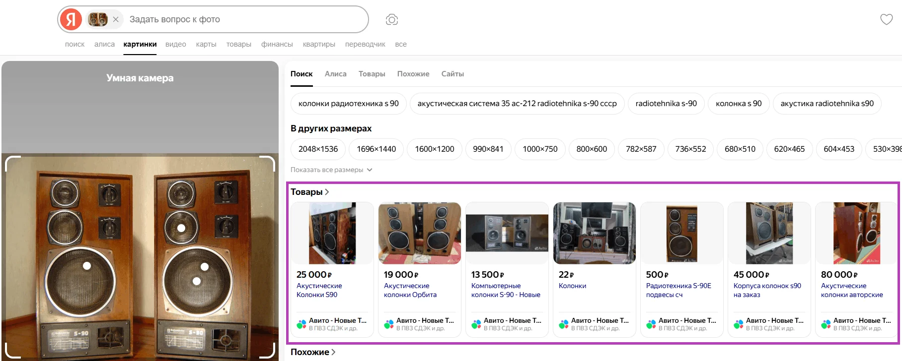 Другой пример: вы решили продать свою антикварную вещь и интересуетесь, по какой цене продаются аналогичные товары. Чтобы узнать ориентировочную стоимость, вы можете загрузить фотографию товара в поисковую систему Яндекс и найти похожие предметы.