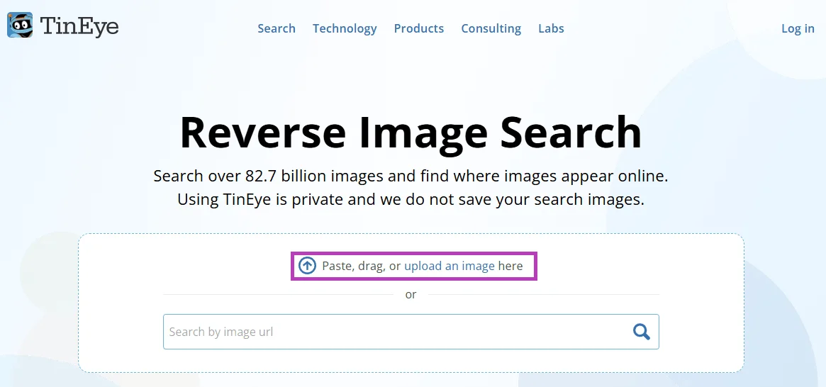 Чтобы воспользоваться TinEye, скопируйте адрес изображения и вставьте его в поле поиска «Paste or enter image URL» либо загрузите изображение с вашего компьютера, нажав кнопку «Upload». После этого нажмите на кнопку поиска — и вы получите результаты по запросу.