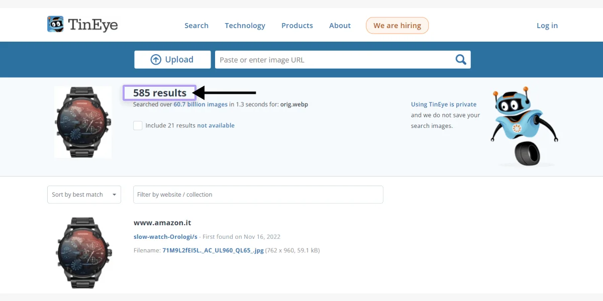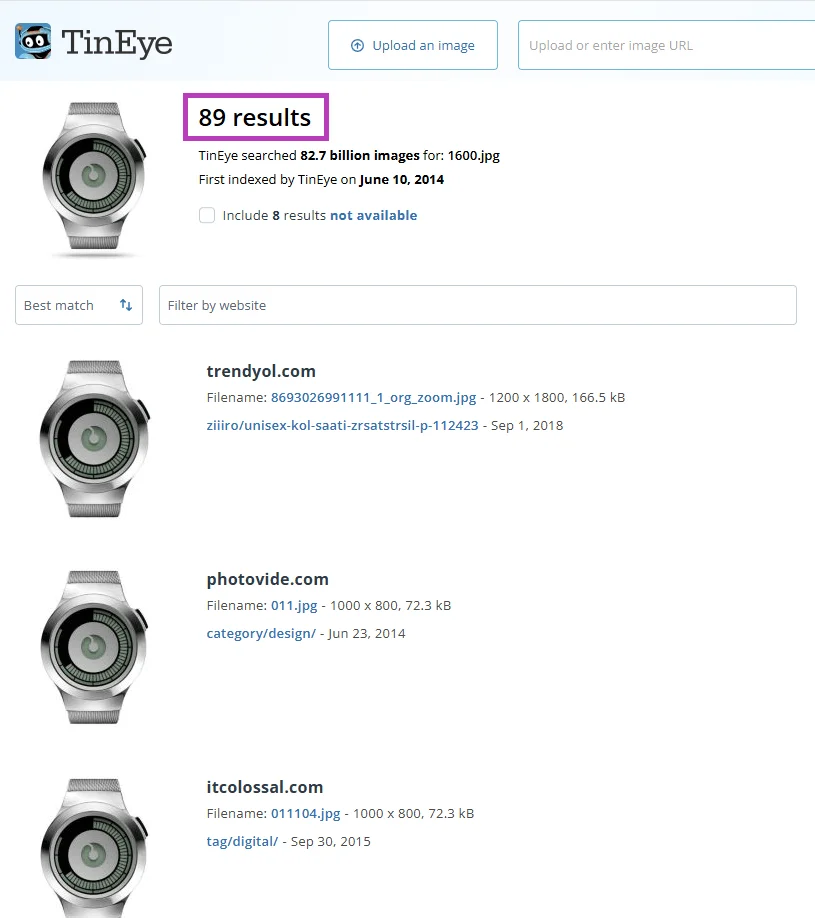 TinEye сильно уступает в поиске по фото Google и Яндексу. Он помогает найти только те товары, фото которых хорошего качества или выделяются на первом плане. Чтобы получить идеальные результаты поиска с использованием этого сервиса, лучше всего предоставить изображение товара на белом фоне без лишних предметов. В отличие от TinEye, Google и Яндекс смогут найти товар, если вы загрузите его изображение в любом виде.