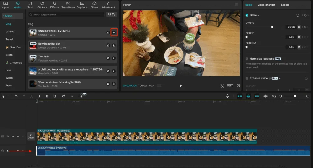 Нажмите на «+» рядом с треком, чтобы наложить его на видео. Он появится на дорожке.