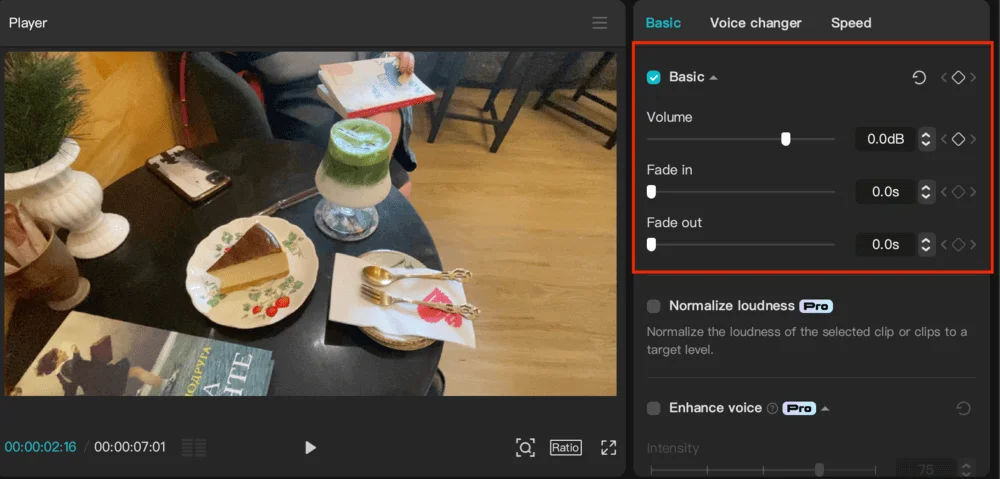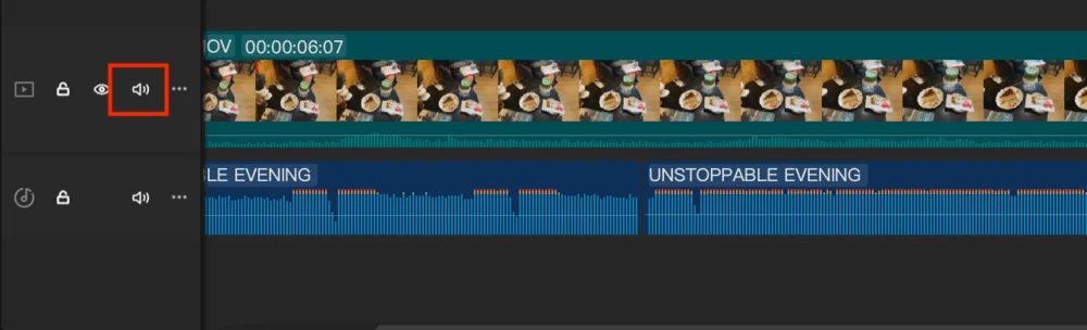 Для настройки звука видео переключитесь на соответствующую дорожку. На этой же панели можно отрегулировать громкость. Или убрать его вовсе, нажав на иконку с громкоговорителем слева от дорожки.