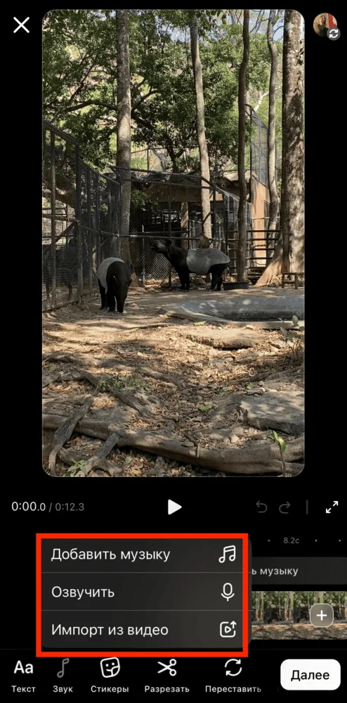 Чтобы наложить звук, нажмите на кнопку «Звук». Вы можете выбрать мелодию из библиотеки платформы, самостоятельно озвучить ролик или импортировать звук из видео.