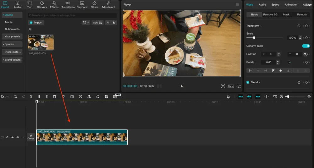 Загрузите видео или изображения через кнопку Import или перетащите их из папки.