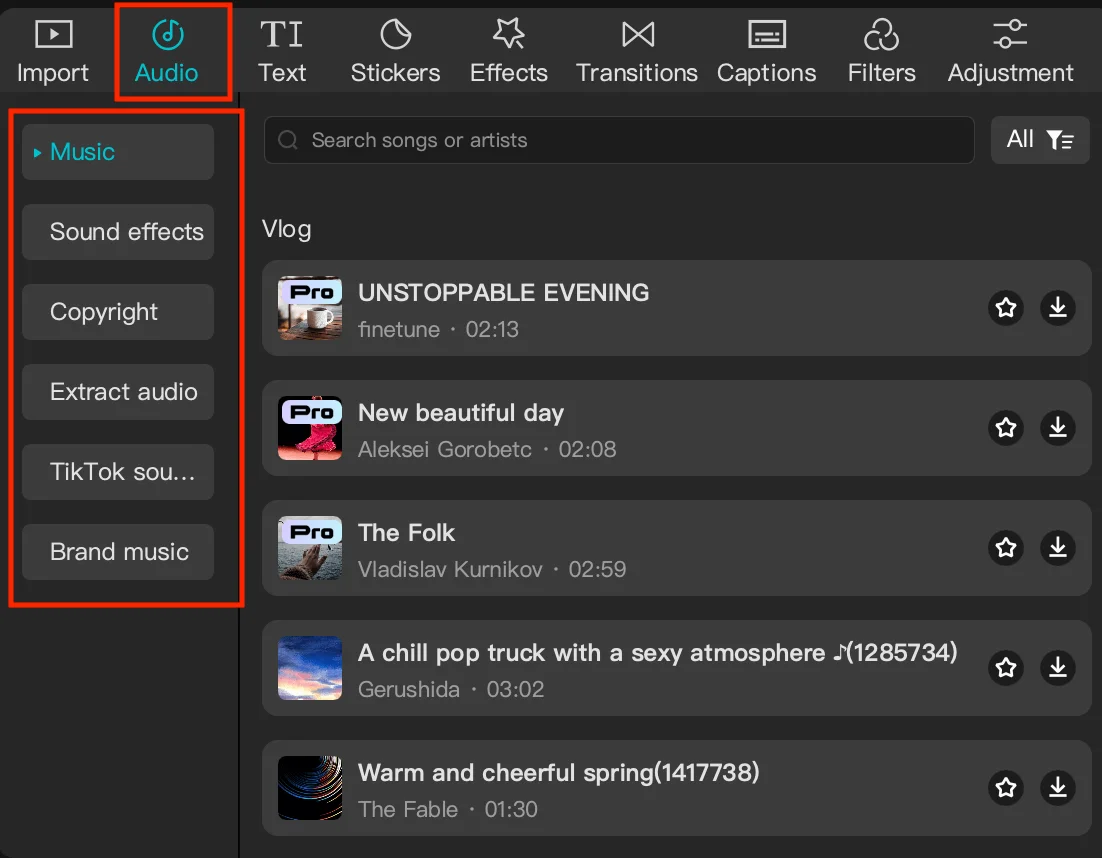 CapCut также предлагает звуковые эффекты (Sound Effects) и авторские композиции (Brand Music). Последняя функция доступна только в платной версии через опцию Brand Kit.