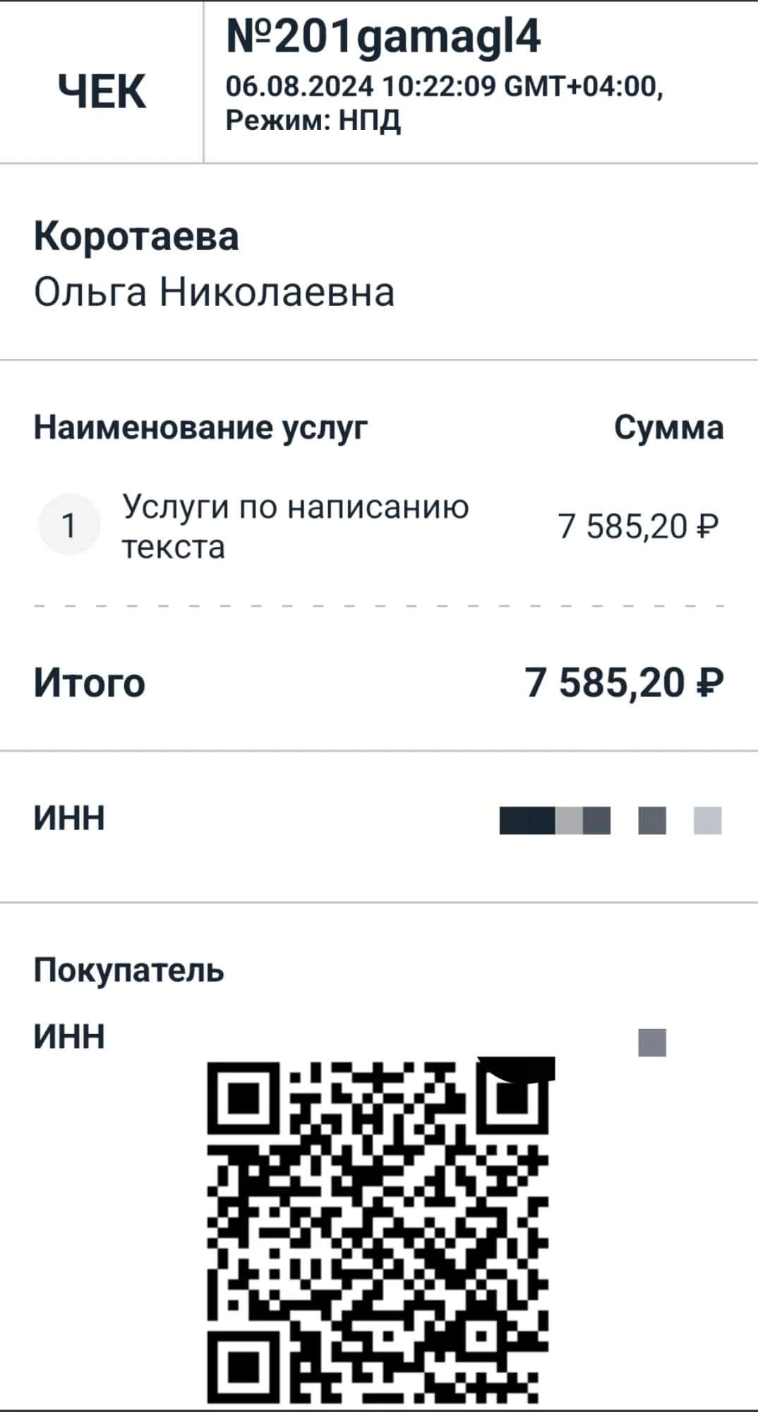 | Перевод | Обычно переводом расплачиваются с удалёнщиками: иллюстраторами, консультантами, разработчиками. Для этого самозанятый предоставляет реквизиты счёта, к которому привязана карта. У самозанятого ИП может быть специальный расчётный счёт для бизнеса, тогда он передаёт заказчику его реквизиты. |