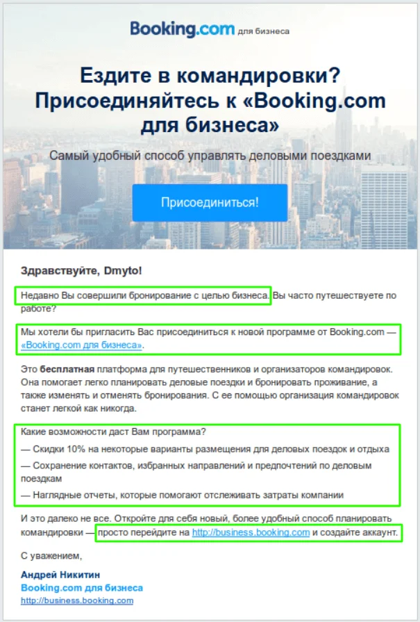 Приветствие. Будьте кратки. Стандартного «Здравствуйте» или «Добрый день» достаточно. Избегайте громоздких фраз вроде «Уважаемая Анна Сергеевна». Однако используйте имя клиента, если у вас есть такая информация. Персональное обращение сразу повышает вовлечённость.