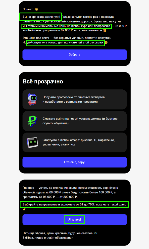 Не перегружайте письмо CTA. Каждое письмо должно иметь одну основную цель. Все элементы призыва к действию (CTA) должны поддерживать эту цель. В длинных письмах кнопку можно повторять для удобства. Но не создавайте несколько разных целей в одном сообщении, иначе внимание читателя рассеивается. Если в письме несколько смысловых блоков, то каждый из них может иметь свою отдельную цель с соответствующим CTA. Но внутри смыслового блока цель остаётся одна.
