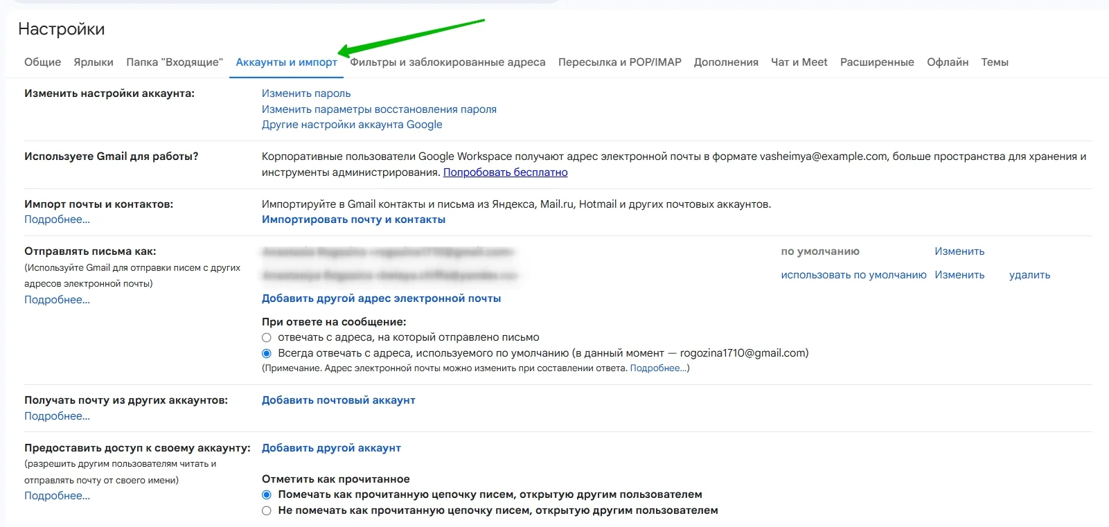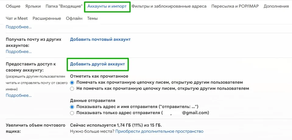 Перейдите во вкладку «Аккаунты и импорт», найдите раздел «Предоставить доступ к своему аккаунту» и нажмите «Добавить другой аккаунт».