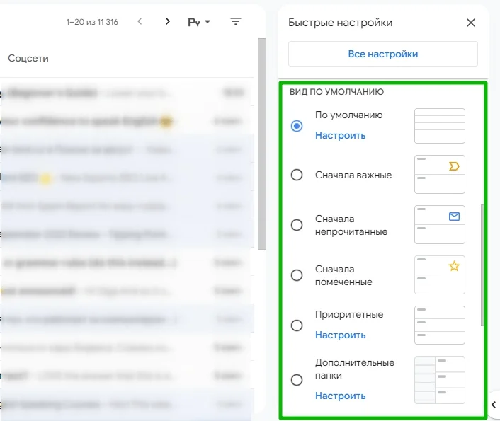 Если нажать кнопку «Настроить» под одним из режимов, вас отправит в расширенные настройки папки «Входящие». Там можно выбрать, например, счётчик непрочитанных писем (будут ли учитываться все помеченные или только из основной папки), а также включить или выключить подборку лучших предложений в разделе «Промоакции». Для каждого типа папки «Входящие» настройки индивидуальны.