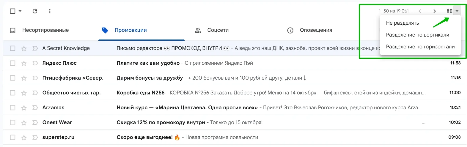 Включить эту опцию можно через быстрые настройки или сразу в основном окне почты. Для этого найдите специальный значок в правом верхнем углу над списком писем и выберите тип разделения — письмо может отображаться снизу или справа.