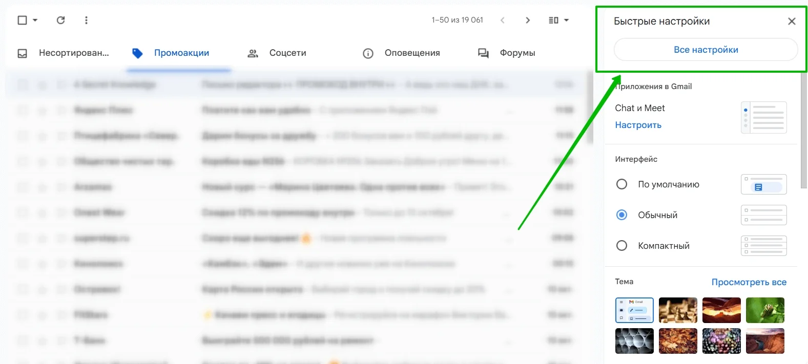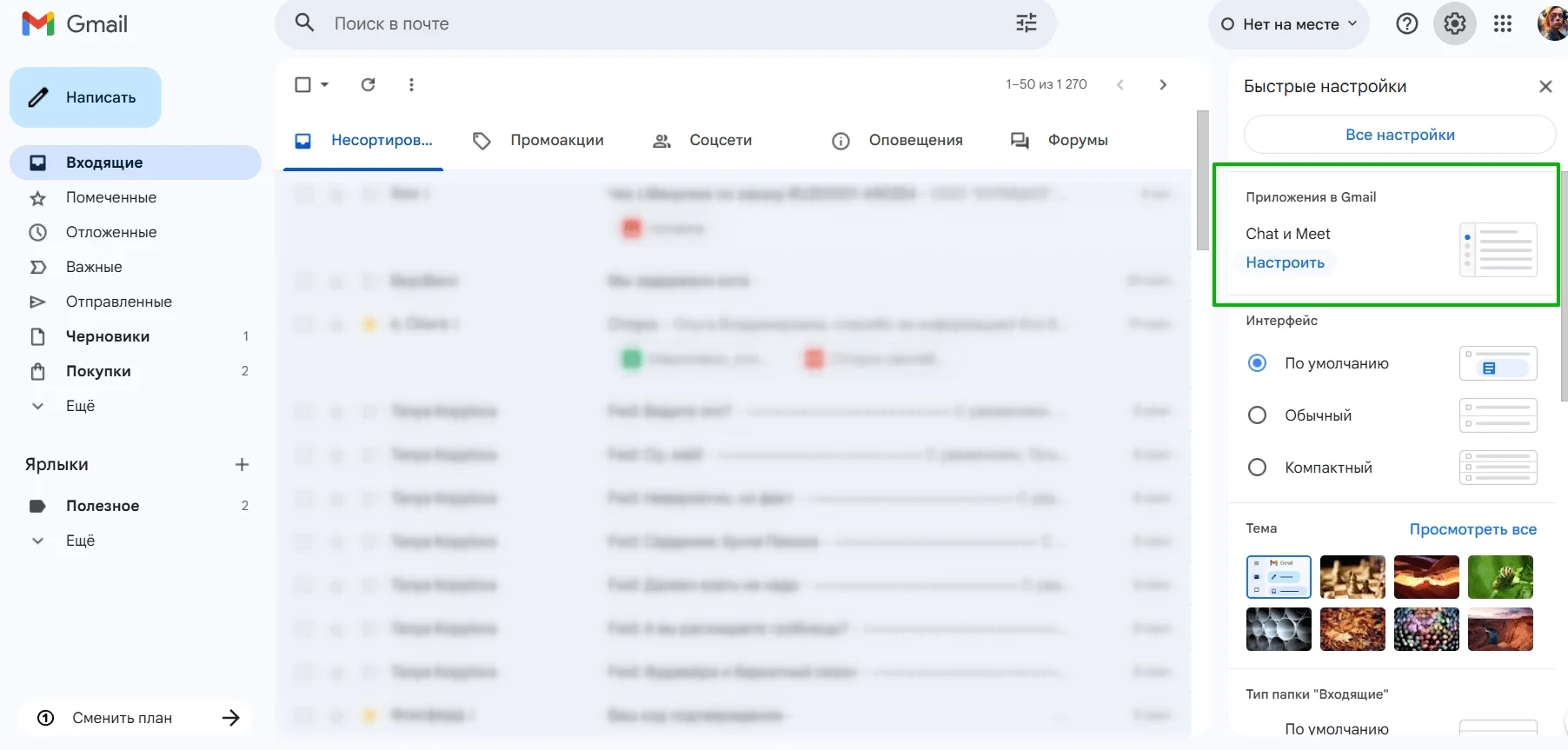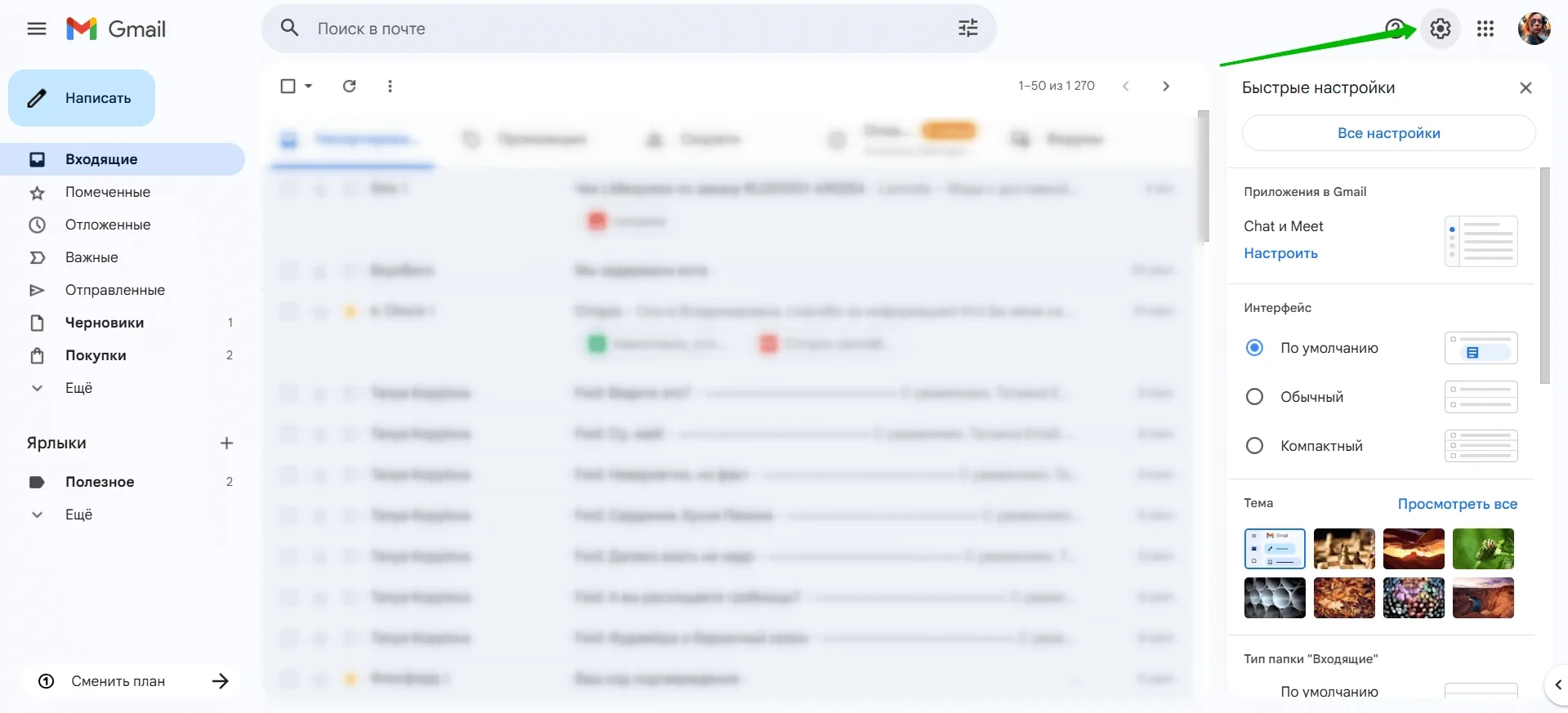 В Gmail есть окно быстрых настроек, где можно за несколько секунд изменить внешний вид почты. Для этого просто нажмите на значок с шестеренкой.