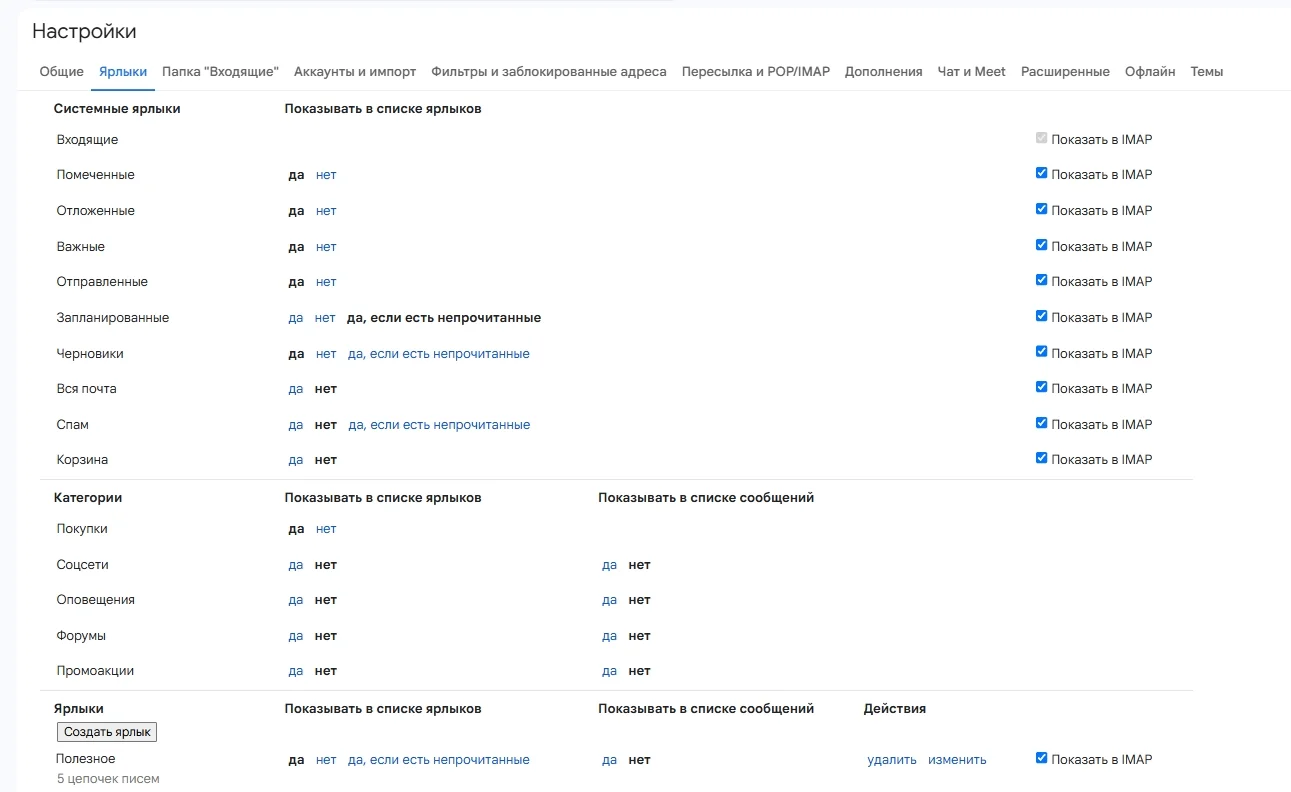 В Gmail ярлыки делятся на системные, «Категории» и пользовательские. Первые нельзя удалить — только включить или выключить их отображение. Например, тем, кто много покупает онлайн, будет полезна категория «Покупки» — но если почта используется только для работы, такой ярлык удобнее отключить.