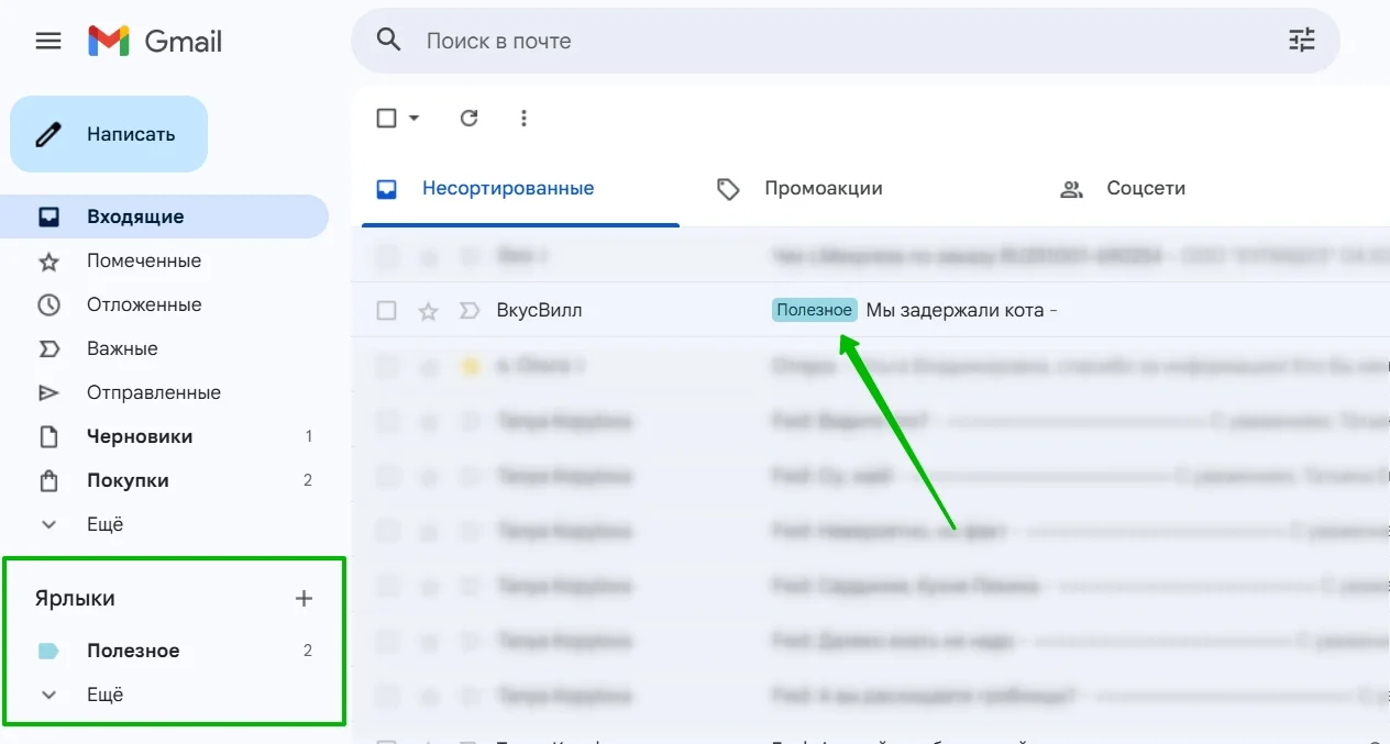 В почтовом ящике ярлыки, созданные пользователем, выделены в отдельный пункт меню — под основными папками и категориями. А в почте отображаются рядом с темой письма.