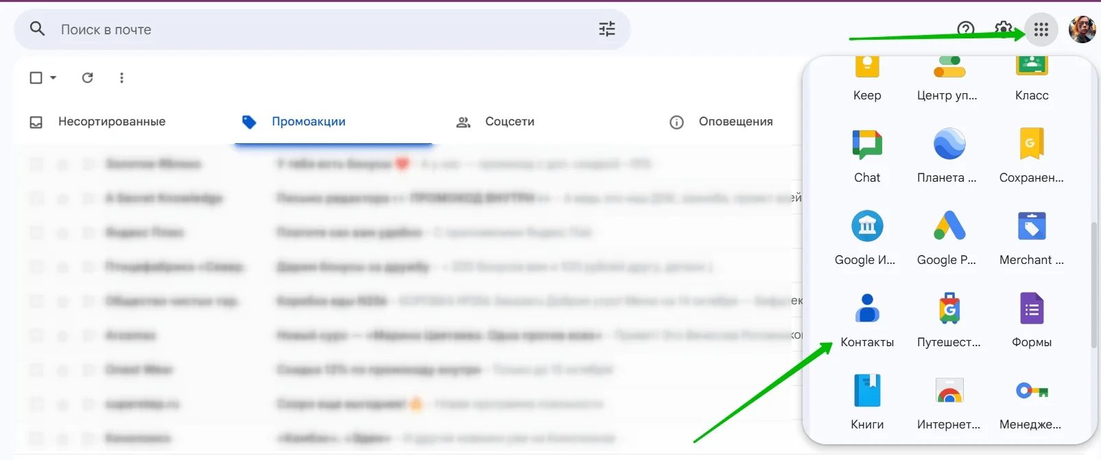 Контакты — отдельный сервис, поэтому искать его надо в перечне инструментов Google.
