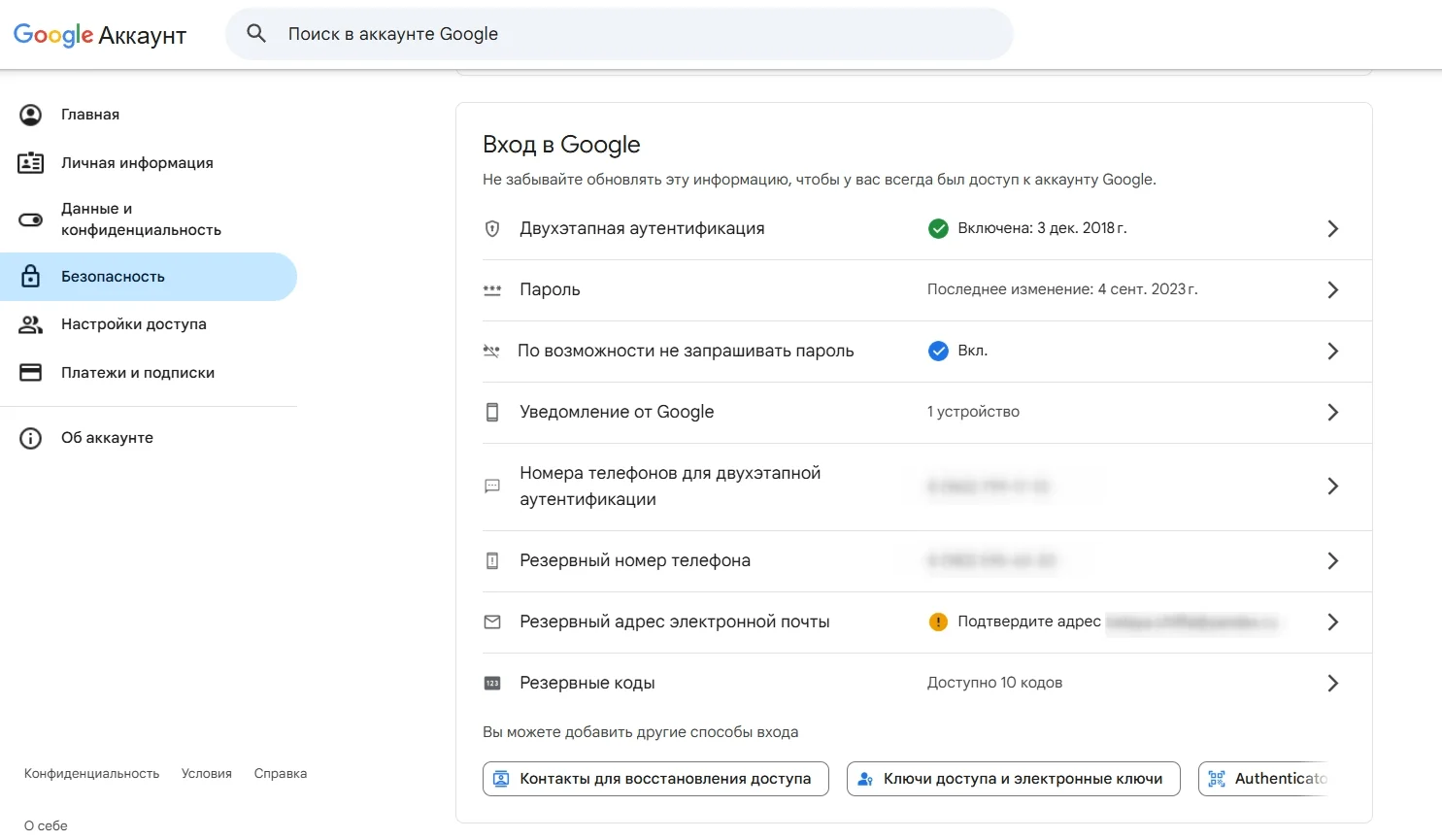 В этом разделе для начала рекомендуем проверить параметры восстановления пароля. Перейдя по соответствующей ссылке, попадём в раздел с полноценными настройками безопасности — там можно включить и выключить двухфакторную аутентификацию, выбрать для неё номера телефонов, указать резервный адрес электронной почты, увидеть связанные с аккаунтом Google приложения.