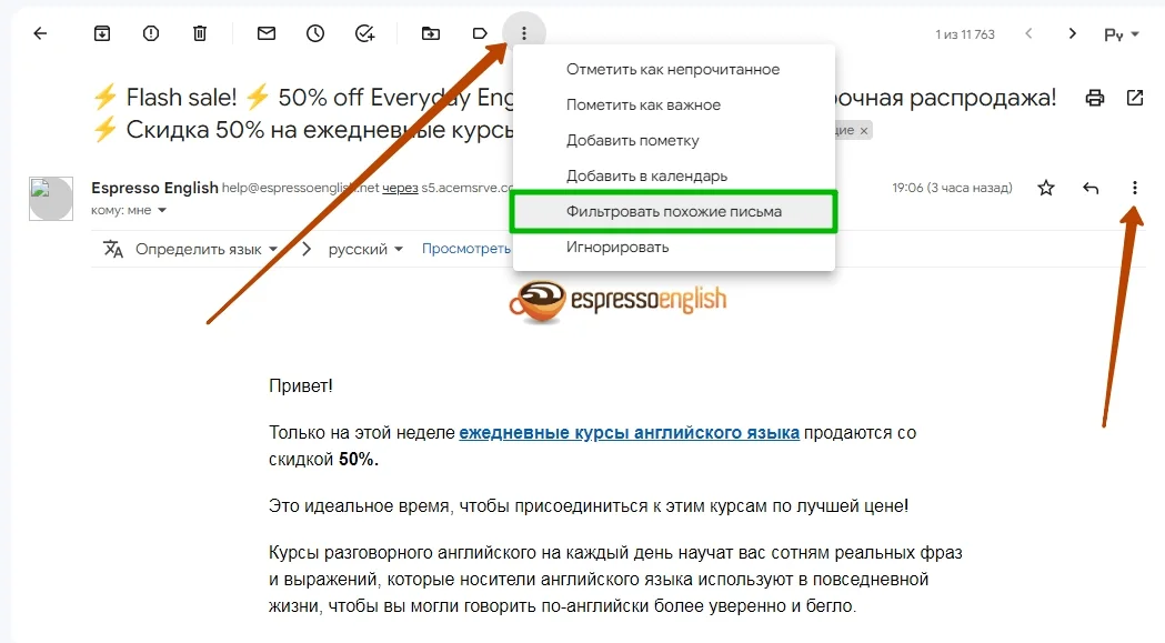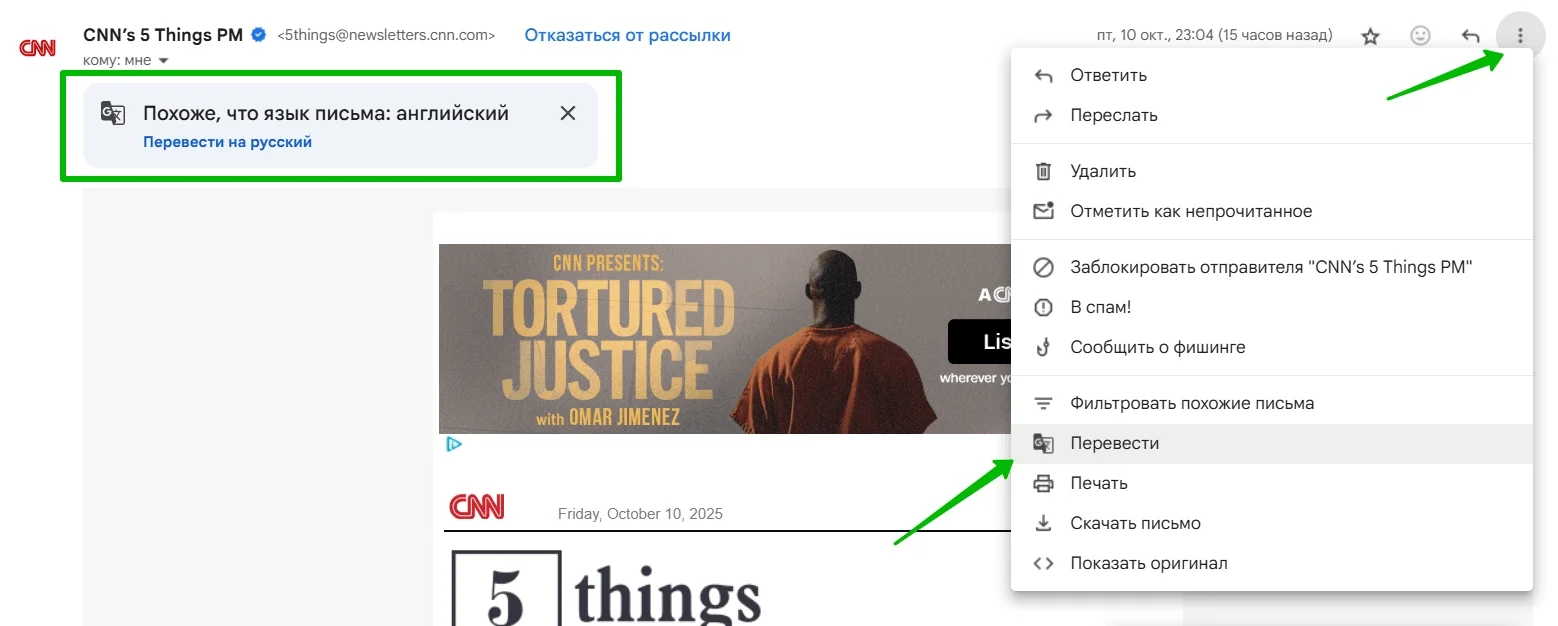 Как правило, опция «Перевести сообщение» отображается в самом верху письма, но иногда ее просто нет. В таких случаях можно воспользоваться меню в правом верхнем углу.