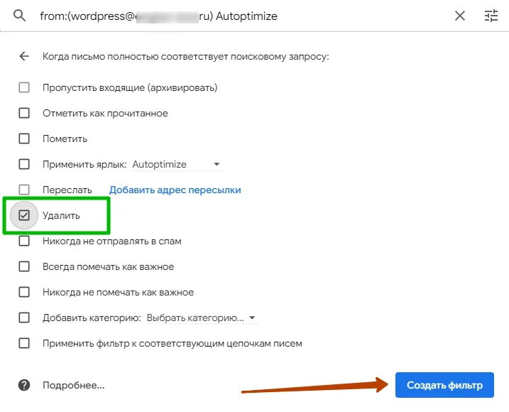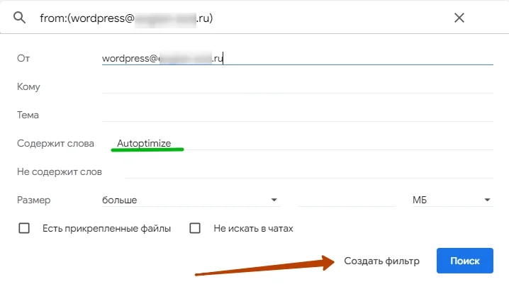 Открываю письмо и выбираю ту же опцию — «Фильтровать похожие письма». В поле «От» уже указан адрес, с которого приходят такие письма. Но этот отправитель относится ко всем письмам, касающимся работы WordPress, в том числе важным. Мне же нужно отсортировать только напоминания от Autoptimize. Поэтому в поле «Содержит слова» добавляю название плагина.