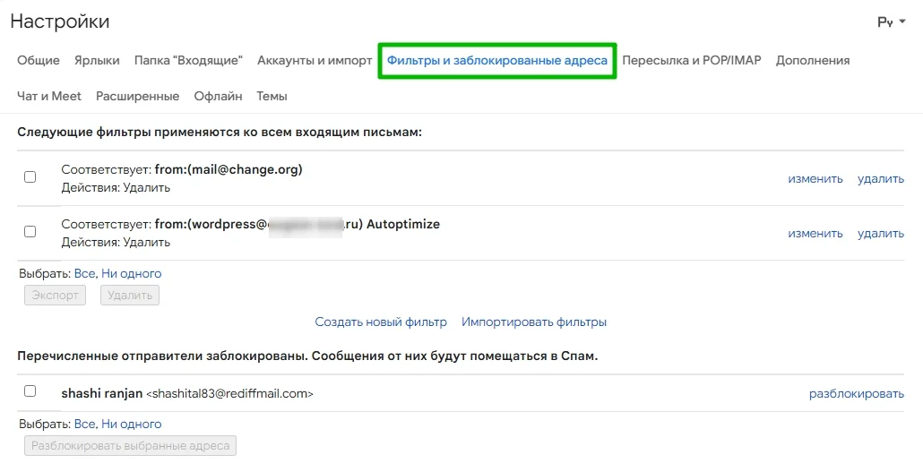 Созданные фильтры отображаются во вкладке «Фильтры и заблокированные адреса» настроек Gmail. Их можно редактировать и удалять.