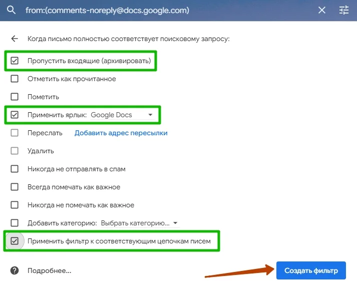 Ищем в почтовом ящике сообщение с комментариями в Google Docs и создаем фильтр для таких писем. В списке действий отмечаем «Архивировать» (обратите внимание, что при активации этой опции пересылать и удалять письмо нельзя). И применяем ярлык с соответствующим именем, который создали ранее.