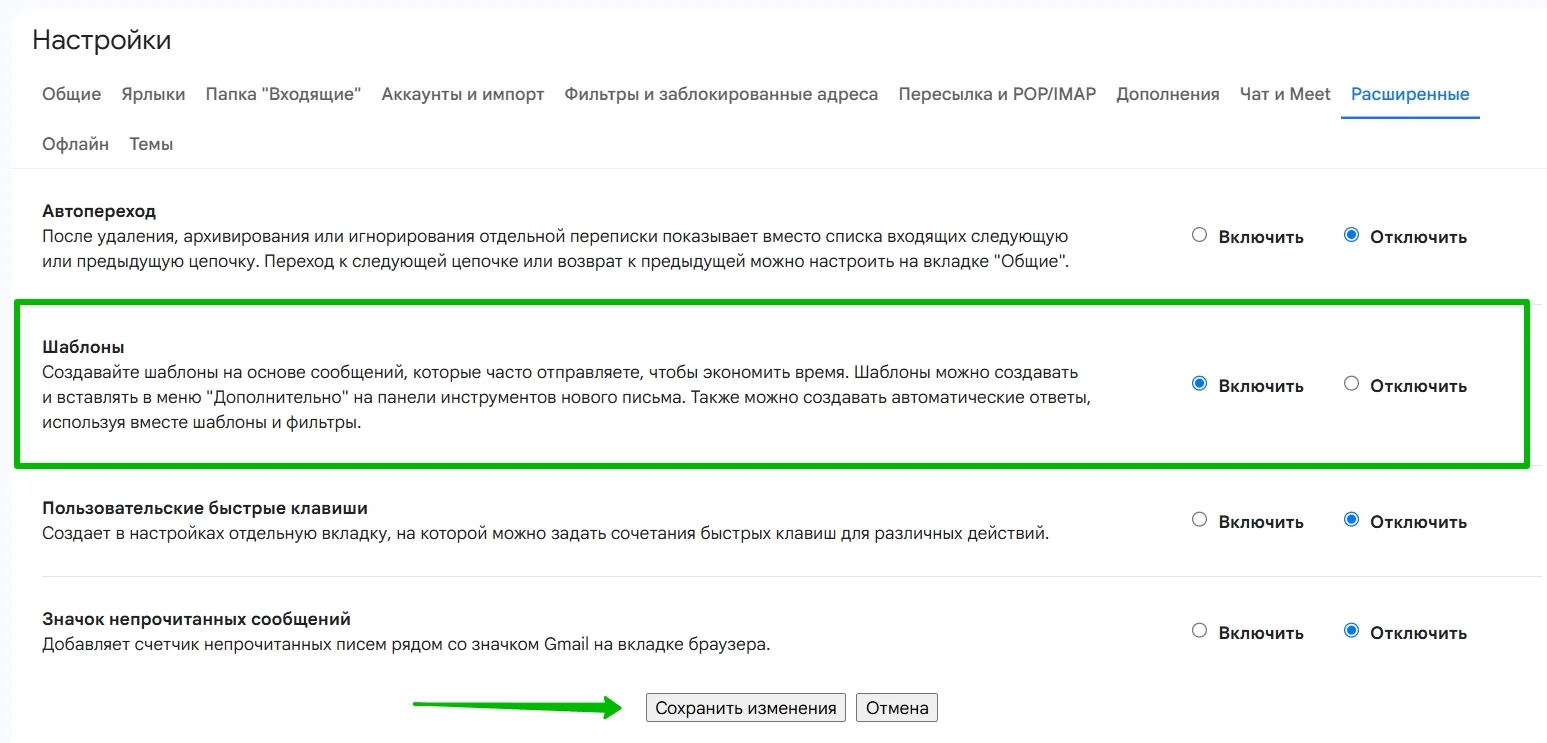 Чтобы шаблоны стали доступны, их нужно активировать в расширенных настройках.