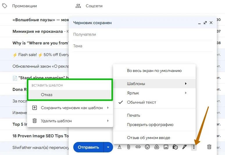 Когда шаблон сохранен, его можно использовать при написании письма. Откройте то же самое меню и выберите появившийся шаблон в разделе «Вставить шаблон».