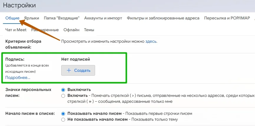 Чтобы создать подпись, зайдите в настройки — нужный инструмент находится в основном разделе, нужно лишь прокрутить страницу вниз.