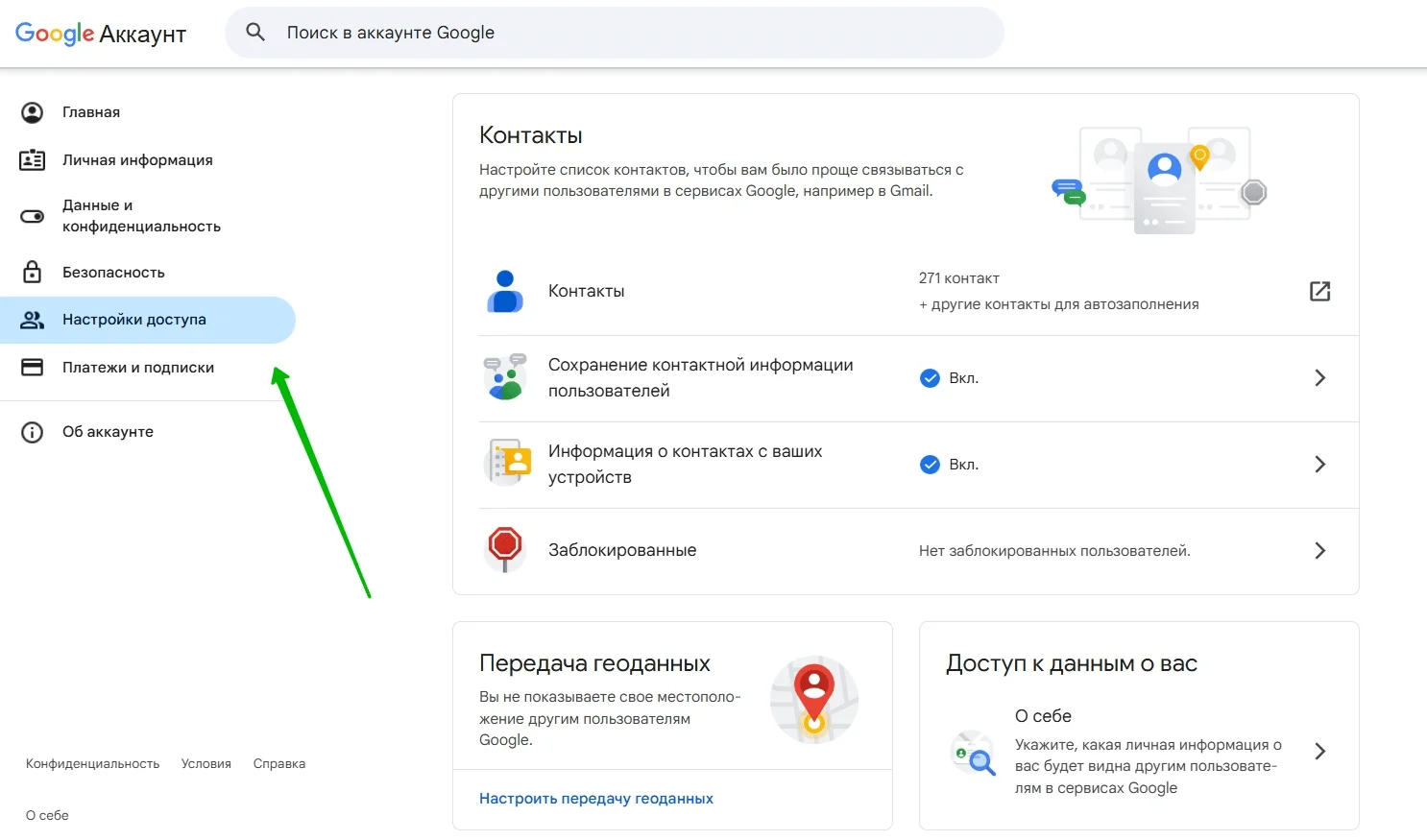 Там же, в настройках Google-аккаунта, рекомендуем сразу проверить и параметры доступа. В этом разделе можно управлять тем, как хранятся ваши контакты и персональные данные вроде геопозиции.