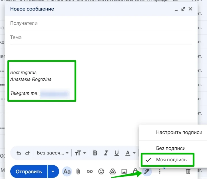 Подпись — очень удобная штука. С ее помощью можно добавлять в конце письма стандартные фразы и контакты. Подписей может быть несколько для разных получателей.