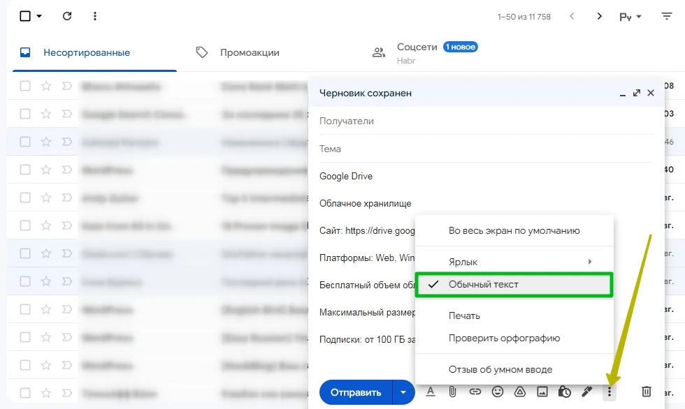 Если в окне отправки вы нажмете на стрелочку справа от кнопки «Отправить», появится опция «Запланировать отправку». С ее помощью вы сможете заранее устанавливать расписание для отправки важных писем. Это удобно, если вы работаете с почтой в нерабочее время или когда получатель находится в другом часовом поясе.