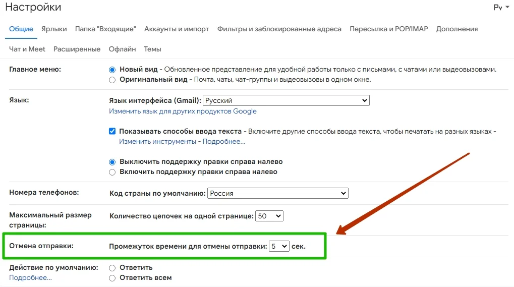 Иногда сразу после отправки сообщения приходит понимание, что зря его отправил — или отправил без вложения и нужной ссылки. Для таких случаев в Gmail есть опция «Отмена». По умолчанию есть лишь 5 секунд, чтобы передумать. Однако это время можно увеличить.