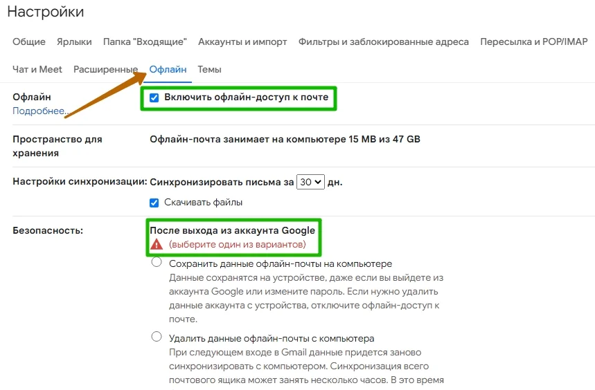Откройте настройки, перейдите во вкладку «Офлайн» и поставьте галочку напротив «Включить офлайн-доступ к почте» — откроются дополнительные настройки.