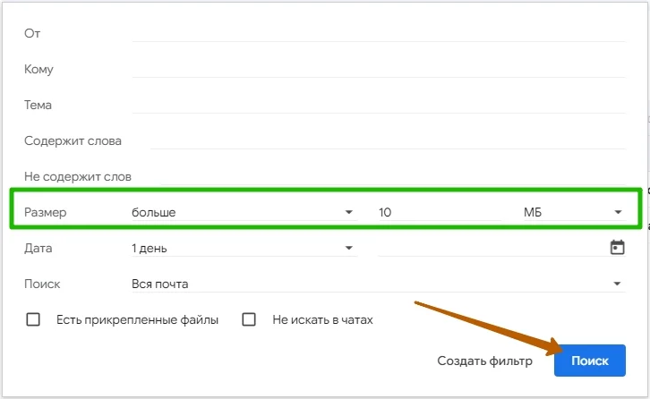 Для этого обратите внимание на параметр «Размер» при создании сортировки. Чтобы найти сообщения с крупными файлами, выбираем характеристику «Больше» и вводим число мегабайт, которое считается внушительным для письма. Например, 10 МБ.