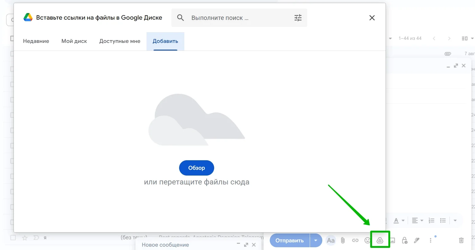 Просто нажмите на кнопку со значком «Google Диск» при создании письма и выберите нужный файл из списка загруженных. Если файл не был залит в облако, сделать это можно прямо в открывшемся окне.