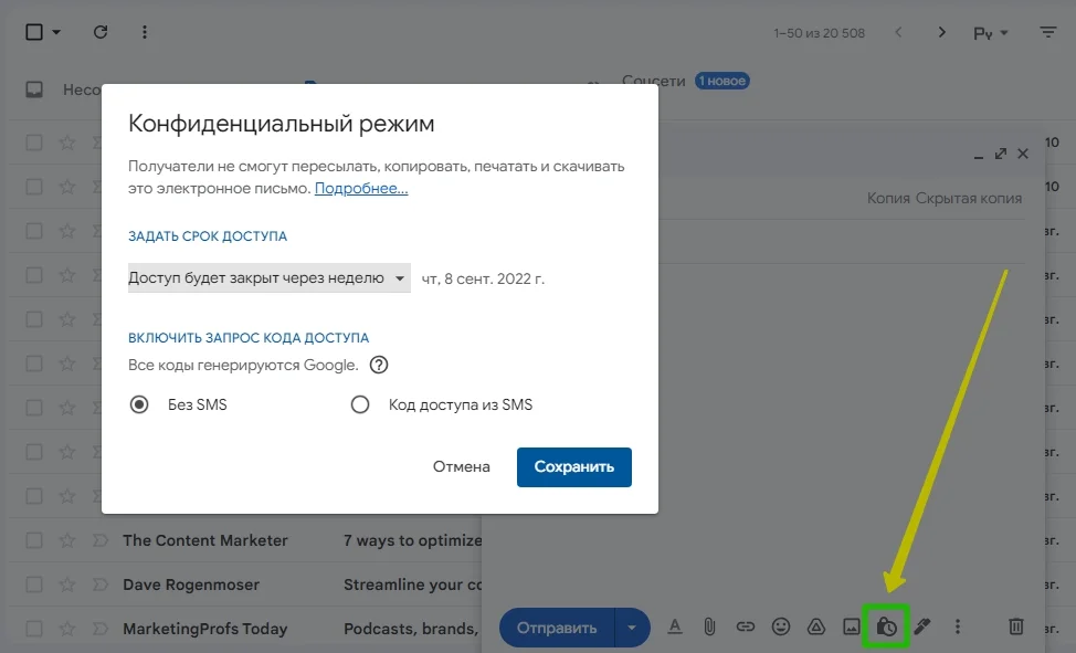 Если включить режим конфиденциальности при отправке, тот, кто получит это письмо, не сможет его переслать, распечатать или скачать. Для дополнительной безопасности можно поставить пароль на открытие email и срок, в течение которого его можно открывать.
