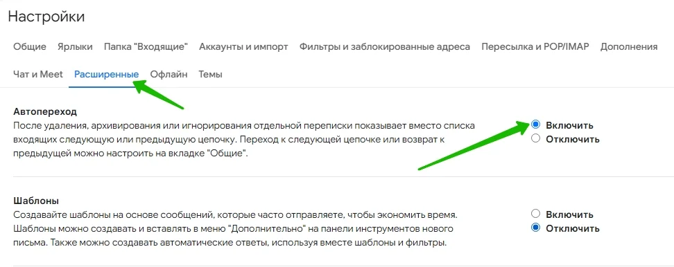 Часто приходится проводить чистку и удалять несколько писем подряд. Когда одно письмо после прочтения удаляется, перед нами вновь открывается ящик со списком полученных email. Чтобы каждый раз не открывать новое письмо, включите опцию автоперехода в расширенных настройках.